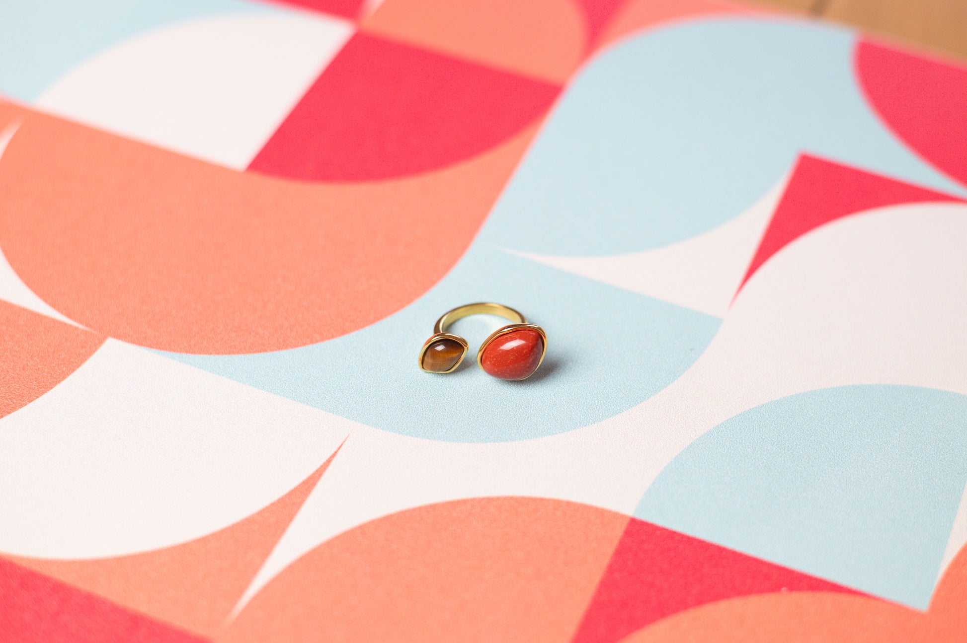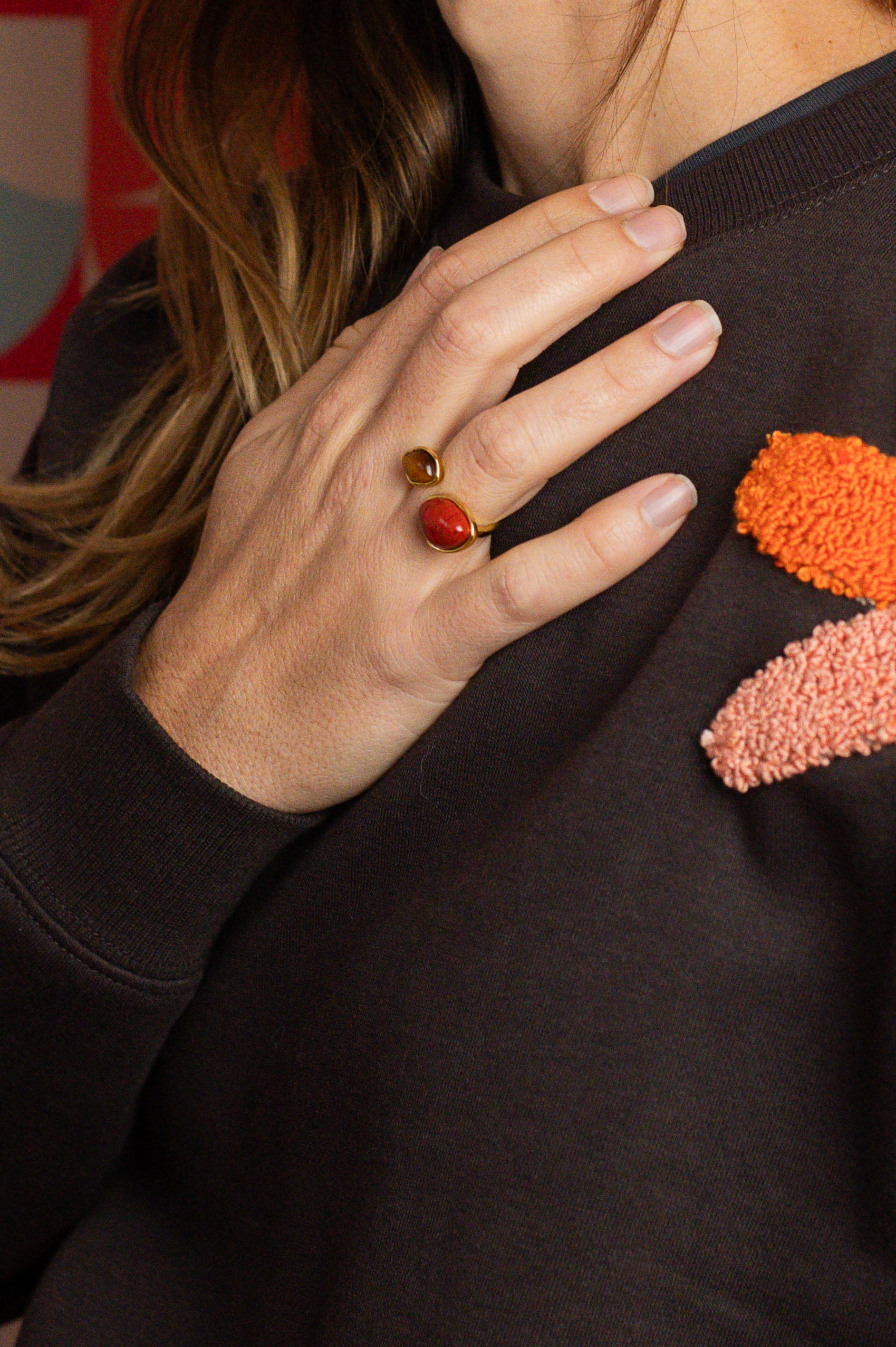 Cette bague avec ses deux pierres est réglable pour d'adapter à tous les doigts.