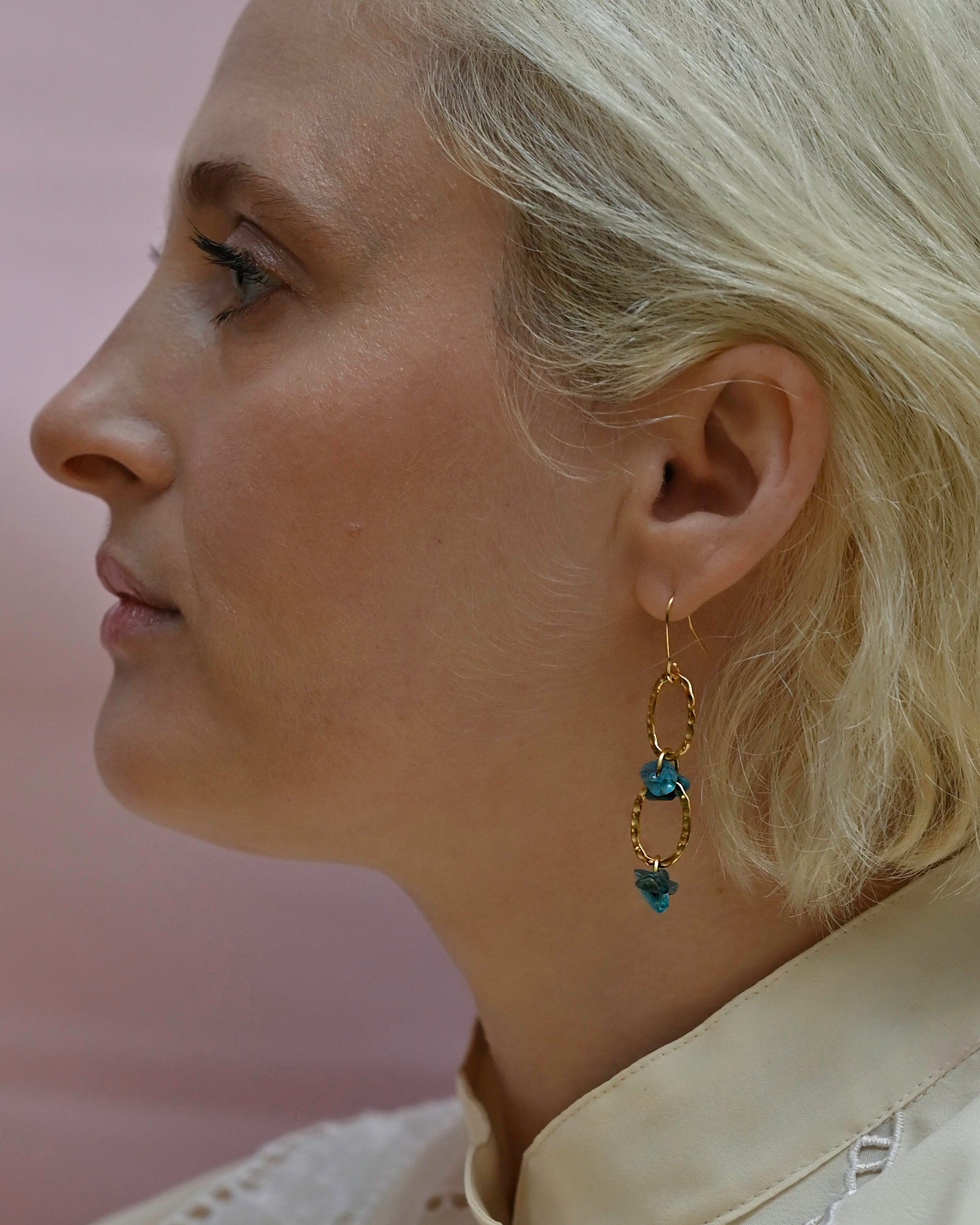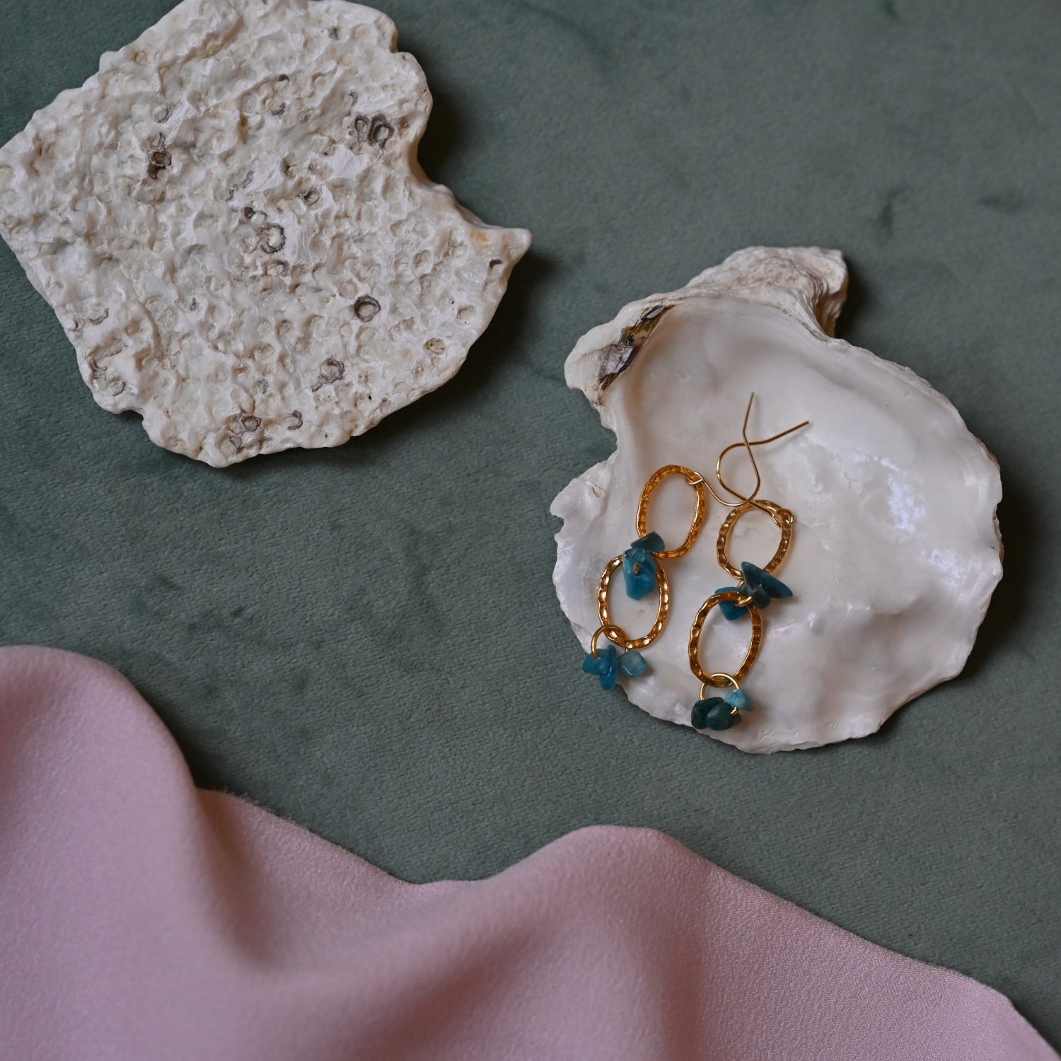 Ces boucles sont en laiton doré avec des pierres apatite bleue.