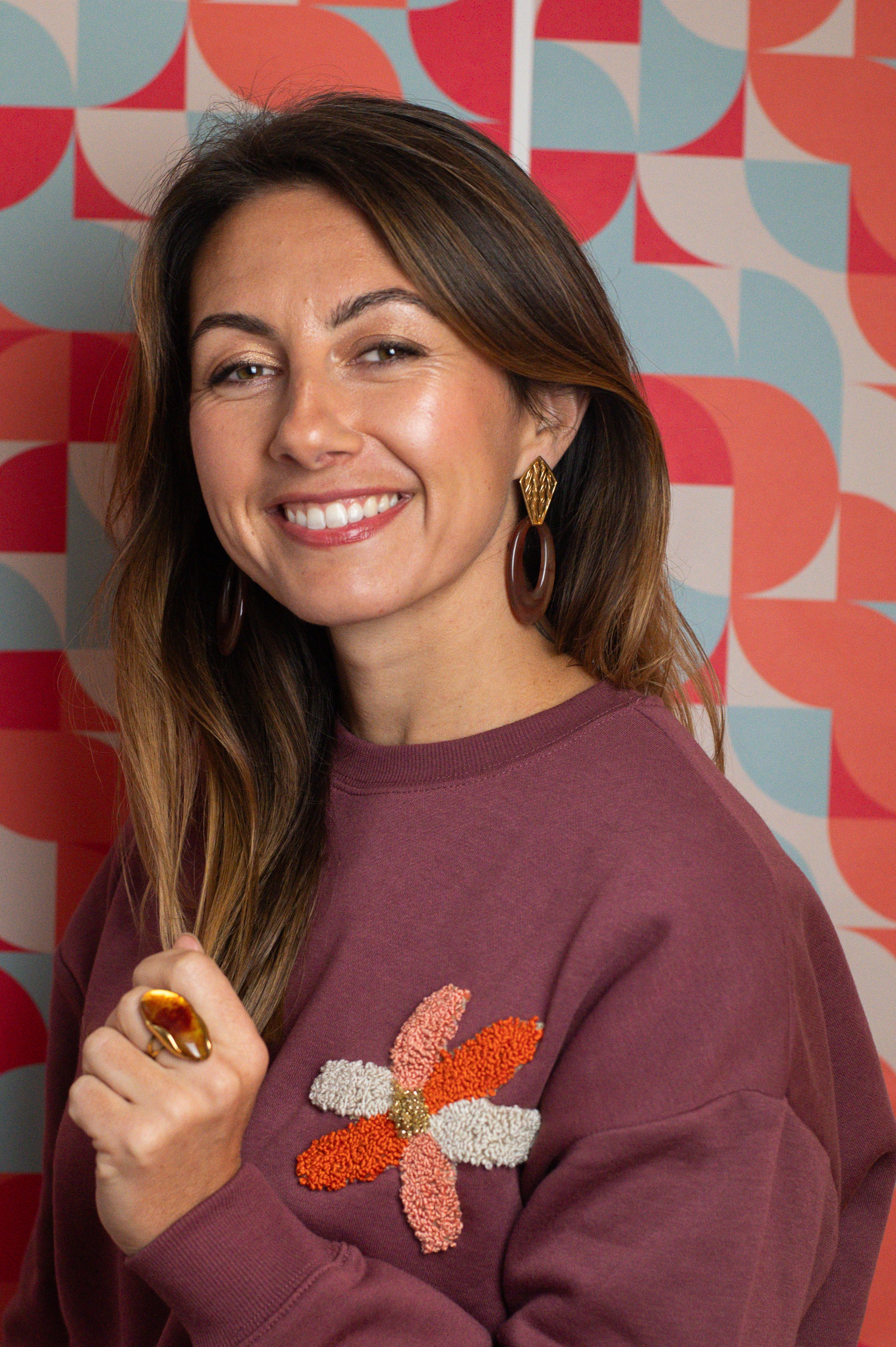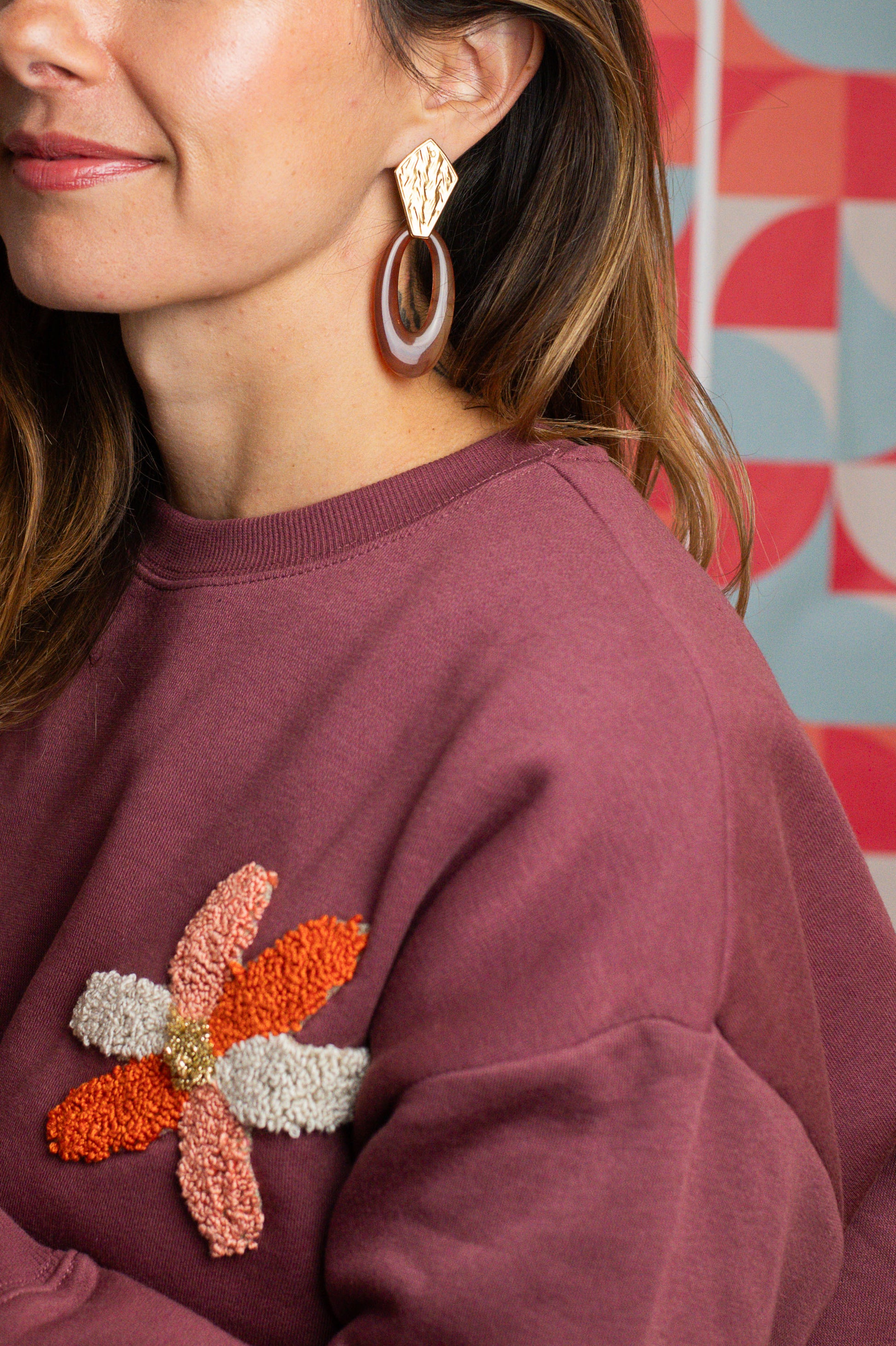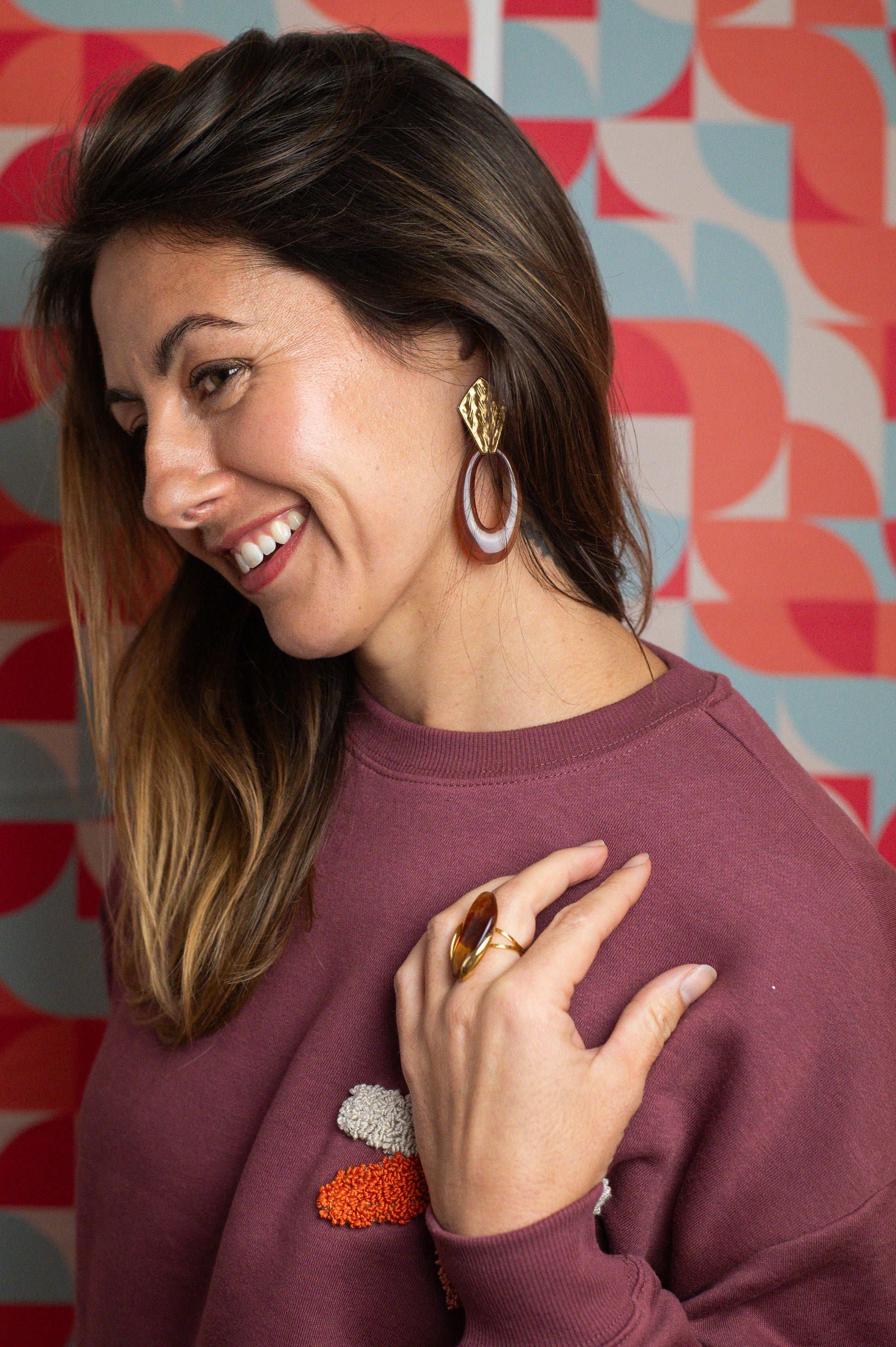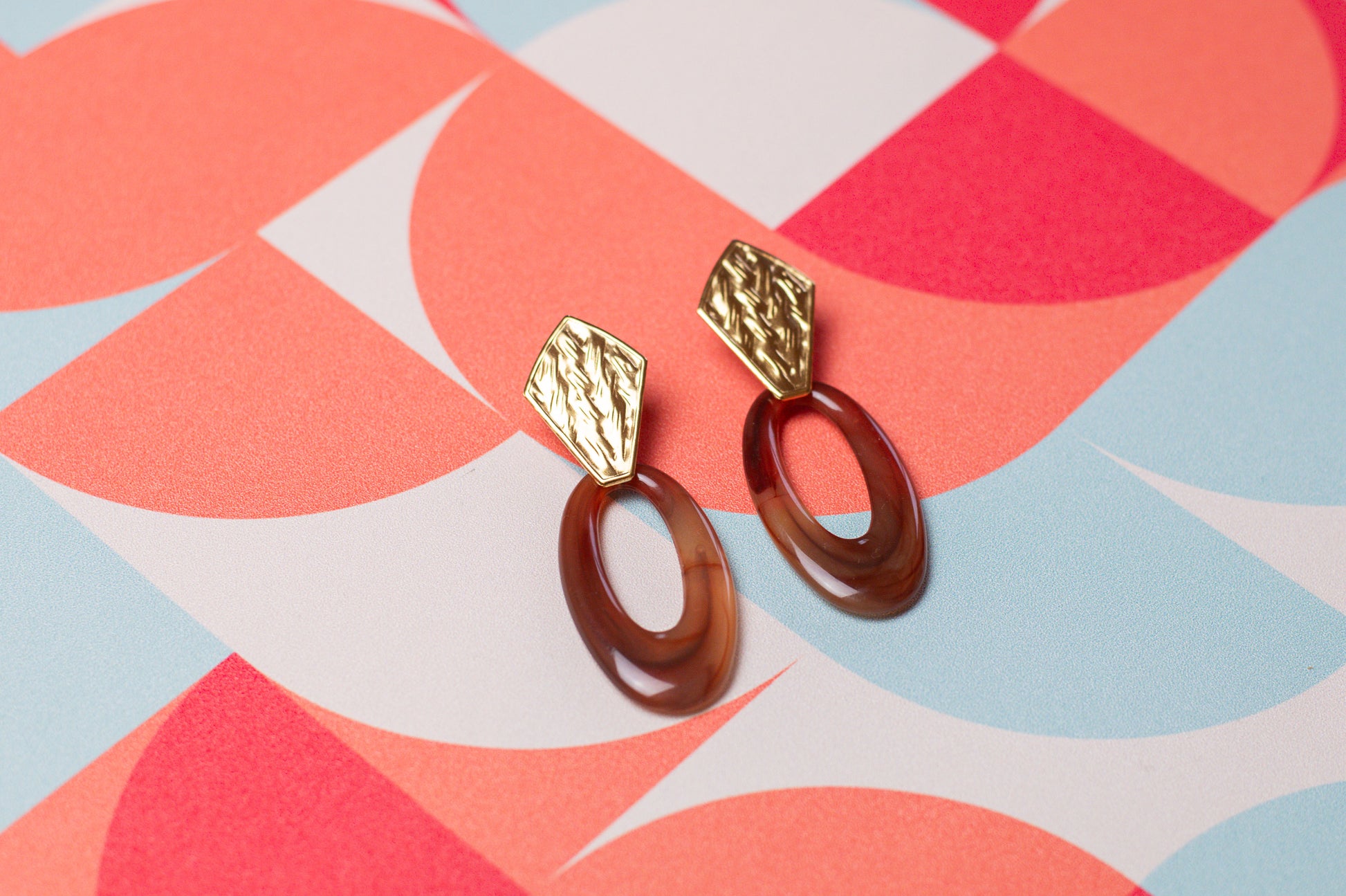 Ces boucles mixent une attache en laiton doré 24k et de l'acétate.