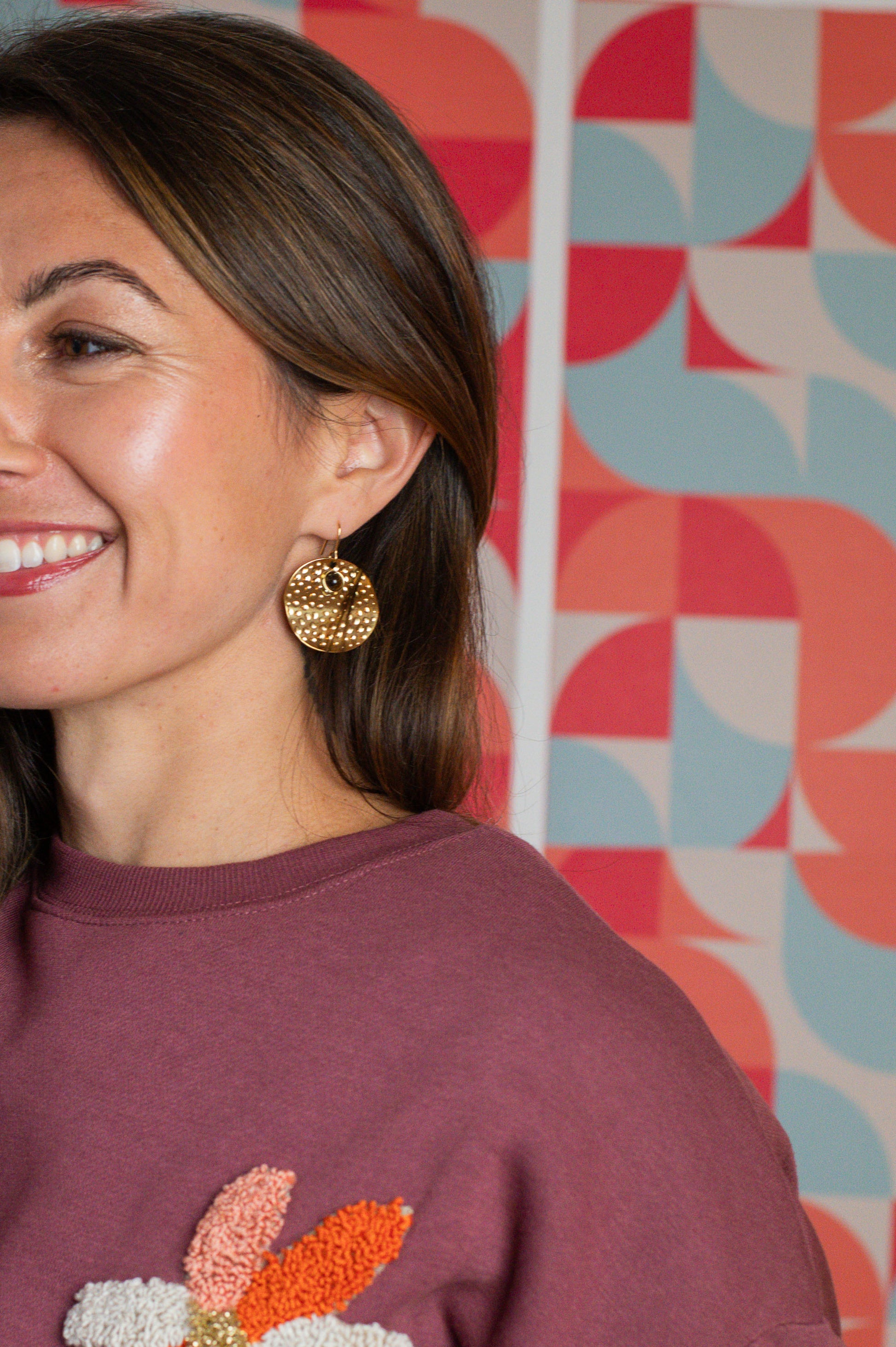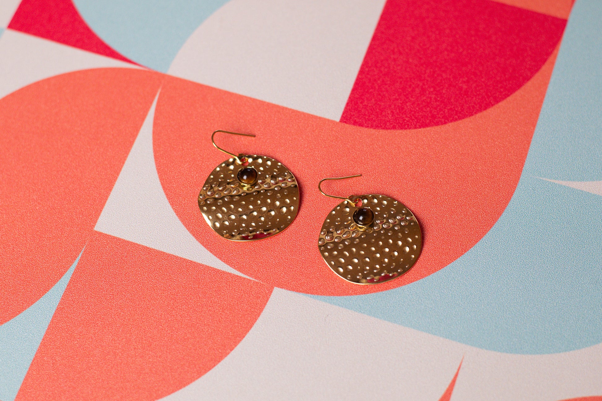 Ces boucles sont en laiton doré 24k avec une pierre oeil de tigre.